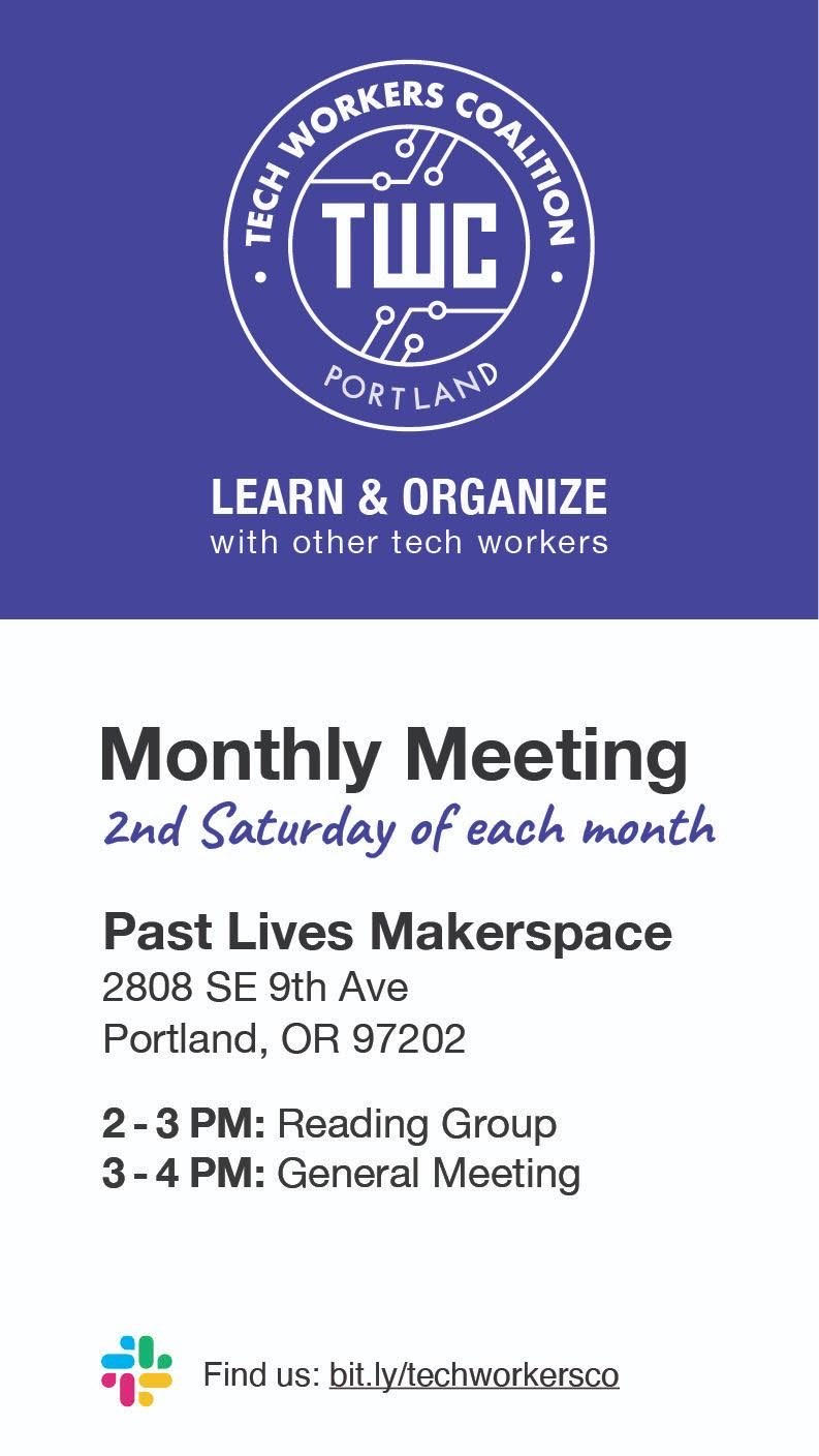 Guided by our vision for an inclusive & equitable tech industry, TWC organizes to build worker power through rank & file self-organization and education.