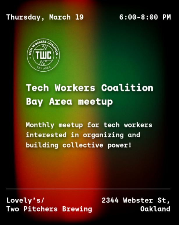 We are a coalition of workers in and around the tech industry, labor organizers, community organizers, and friends. We work in solidarity with existing movements towards social justice, workers' rights, and economic inclusion.